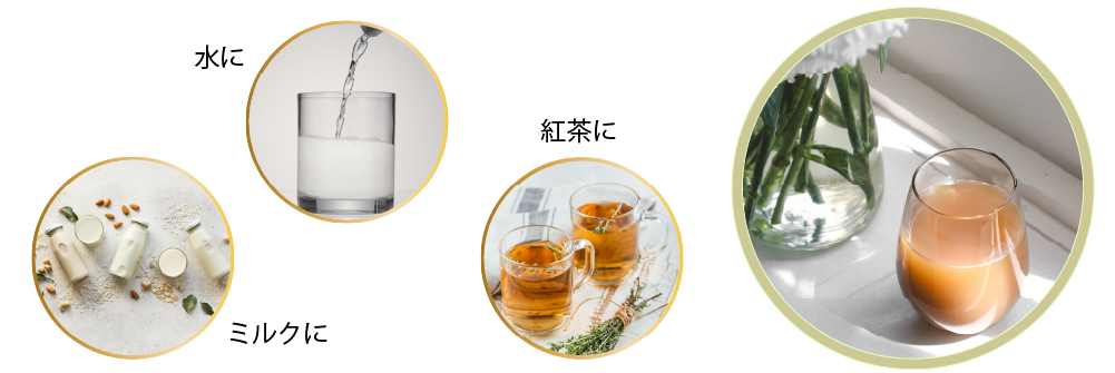 大さじ5杯程度(30g)を、200ml〜250mlの水やお好きな飲み物に溶かしてお召し上がりください。溶けやすく泡立ちにくいので、グラスでもお召し上がりいただけます。