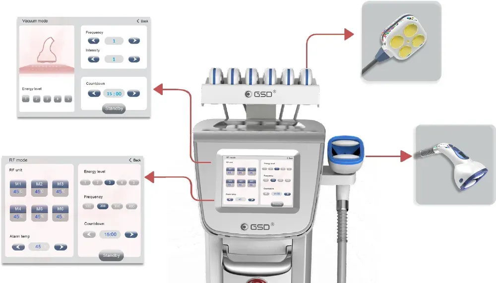「バイポーラRF 技術」「赤外線」「バキューム技術」を兼ね備え、肌を引き締め、より高い結果に導くようにボディラインの悩みに積極的にアプローチします。