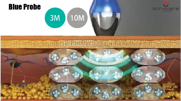 SONOCAREの最大の特徴は、10Mhzの周波数です。3mm以下に届き、表皮層(表皮、真皮)を効果的に刺激します。極めてわずかな振幅を起こし、これは細胞膜にまで広がります。振幅はわずかな1.8mmなので、ナノマッサージ効果と呼ばれています。この振幅は細胞だけでなく細胞内のタンパク粒子も刺激することが可能で、皮膚細胞の再生にも最も効果があります。また1Mhzの超音波振動幅は0.018µmと言われ細胞10µmより小さく細胞膜0.005µmより大きいです。10Mhz超音波は0.005µmより小さく0.0018µmで更に微細なマルチ振動により効果的と言われています。