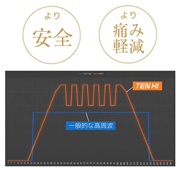 高周波のひとつのパルスを複数のパルスに分割することで、従来の高周波よりも深く熱を伝達し痛みを緩和できるため、より安全に痛みの苦手な方にも施術しやすいのが特徴です。