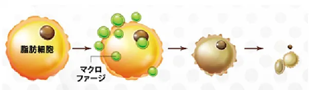 これにより、中性脂肪の分解スピードが上がり、多量の遊離脂肪酸が発生します。血中に流れ込んだ遊離脂肪酸が一定量を超えると、細胞機能に障害が起き、アポトーシス(脂肪細胞の自然死滅)が発生します。その後マクロファージなどによって貪食され老廃物として体外に排出されます。
