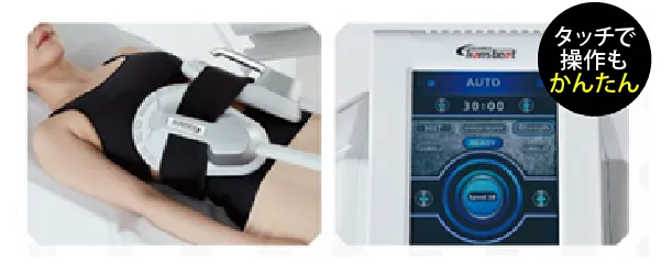 施術はプローブを部位にセットし専用バンドで巻くだけ。操作もタッチパネルで簡単!施術中は完全非接触なので施術者の手が空き、技術ムラも心配なく負担軽減・時短に繋がります。また、服の上から施術でき脱ぐことに抵抗があるお客様にも好印象です。
