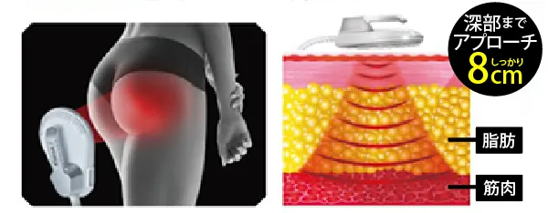 トランスビートは範囲が広く、脂肪や筋肉の深い部分にもしっかりアプローチできます。従来機の「脂肪を減らす」だけではありません。電磁波パルスで脂肪を激しく代謝し、同時に筋肉を強化する、全く新しいボディシェイプ技術を搭載しています。